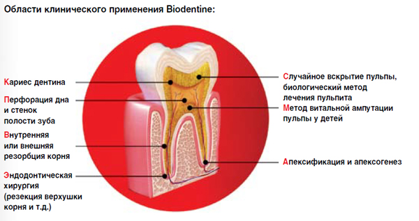Biodentine – это современный материал, являющийся заменителем натурального дентина (твердых тканей зуба, находящихся под эмалевым слоем). По своим свойствам материал максимально близок природному дентину, может успешно заменять его в области как коронковой, так и корневой части зуба. Он обладает высокой биологической совместимостью, не оказывает негативного воздействия на пульпу и позволяет создать оптимальные условия для сохранения ее жизнеспособности и оздоровления. Преимуществами для пациента являются отсутствие чувствительности после процедуры и долгосрочность проведенной реставрации. В отличие от обычных пломбировочных материалов Биодентин биологически активен, способствует образованию вторичного дентина и дентинных мостиков.