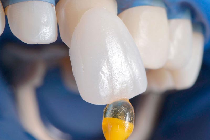 - Непрямая при помощи виниров – этот вид выполняют стоматологи-ортопеды. В этом случае зуб сначала препарируется, а затем с него снимается слепок. По данному слепку в зубо-технической лаборатории из керамической массы делается винир, после чего он фиксируется к зубу.